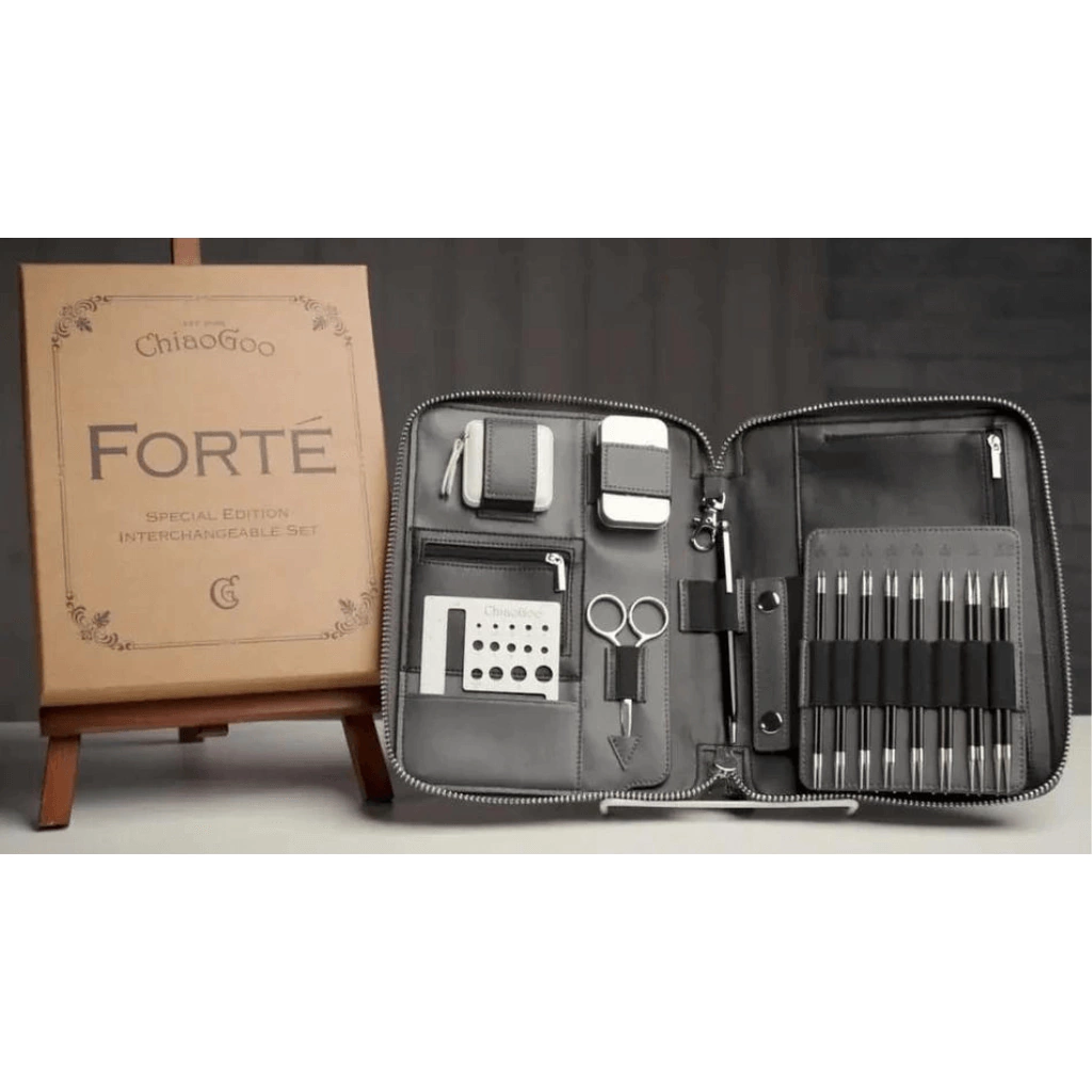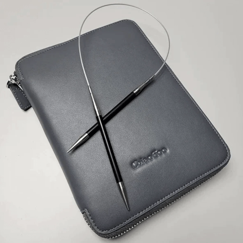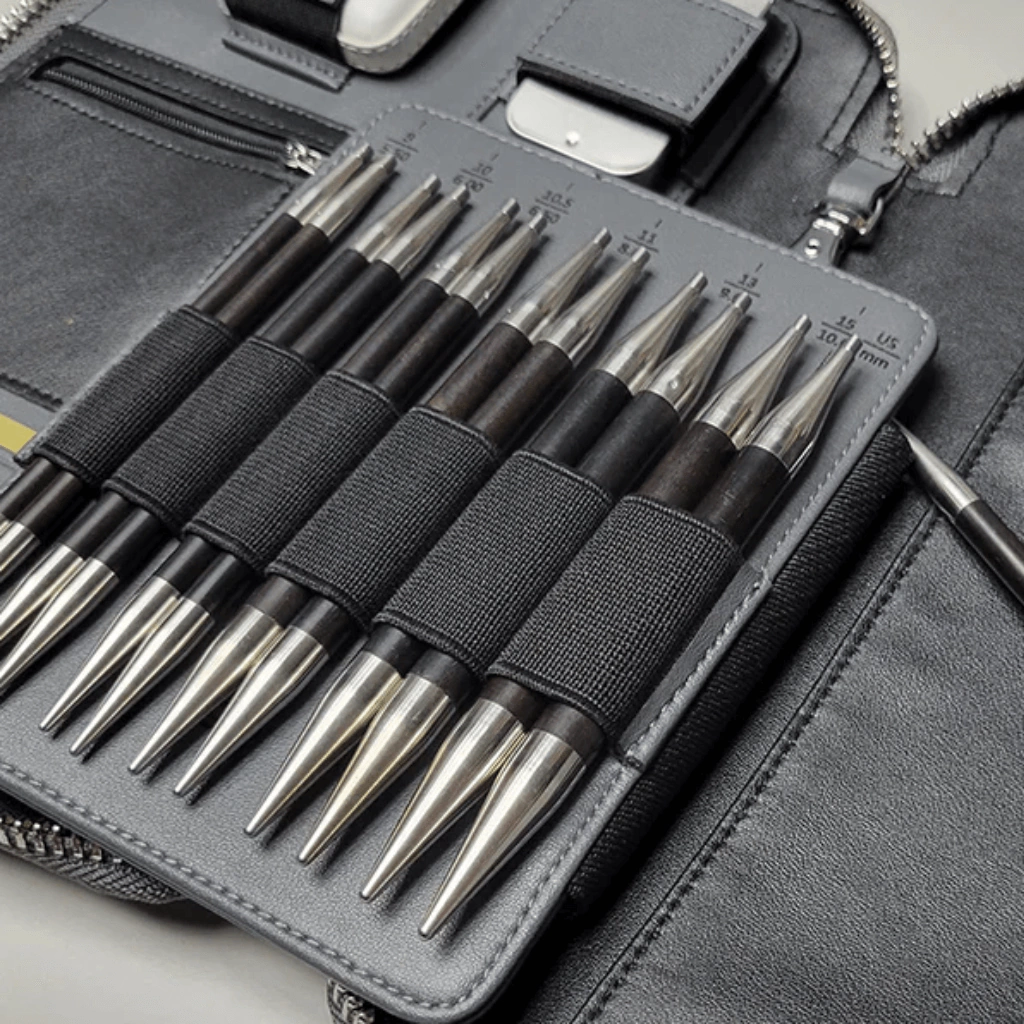El Set de Agujas Circulares Intercambiables Forté 2.0 de Chiaogoo es una edición especial que incluye 8 pares de agujas circulares intercambiables fabricadas con fibra de carbono y acero inoxidable, junto con otros 6 pares hechos de lmadera Blackwood africano, con puntas de acero inoxidable. Cada aguja cuenta con su tamaño grabado con láser, lo que te permite encontrar rápidamente el grosor que necesitas entre este lujoso set.