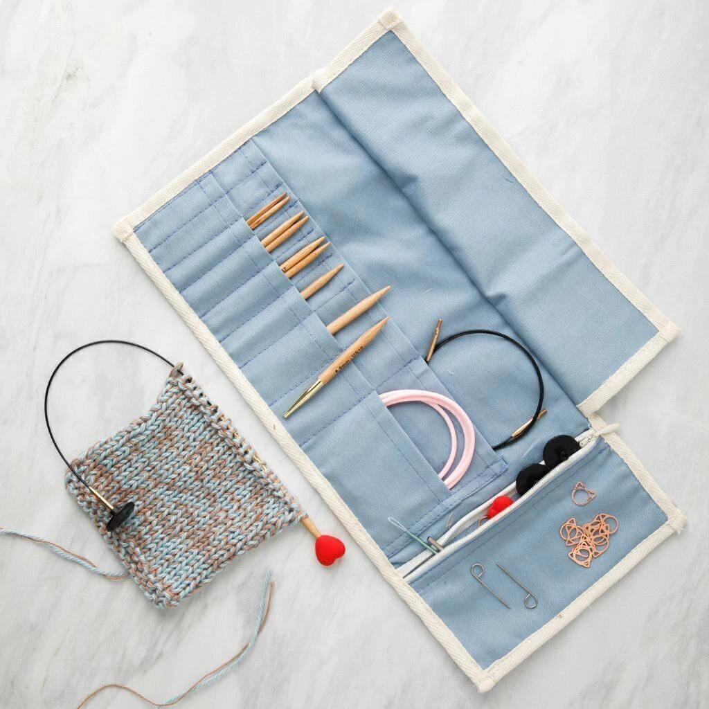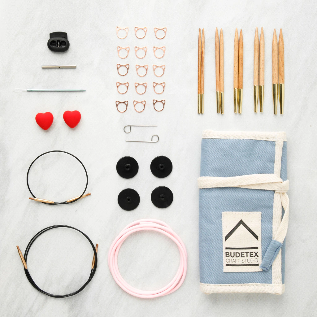 Este set es la opción más accesible dentro de la línea de circulares KnitPro, y el único disponible con agujas de 10 cms, ideales para tejer circunferencias pequeñas como mangas o cuellos, lo que lo convierte en una excelente puerta de entrada al mundo del tejido con calidad profesional. Incluye cables sin memoria, conectores, topes, llaves de sujeción, protectores de punta, aguja lanera, marcadores de punto y un portaagujas textil minimalista de nuestra línea Budetex Craft Studio.