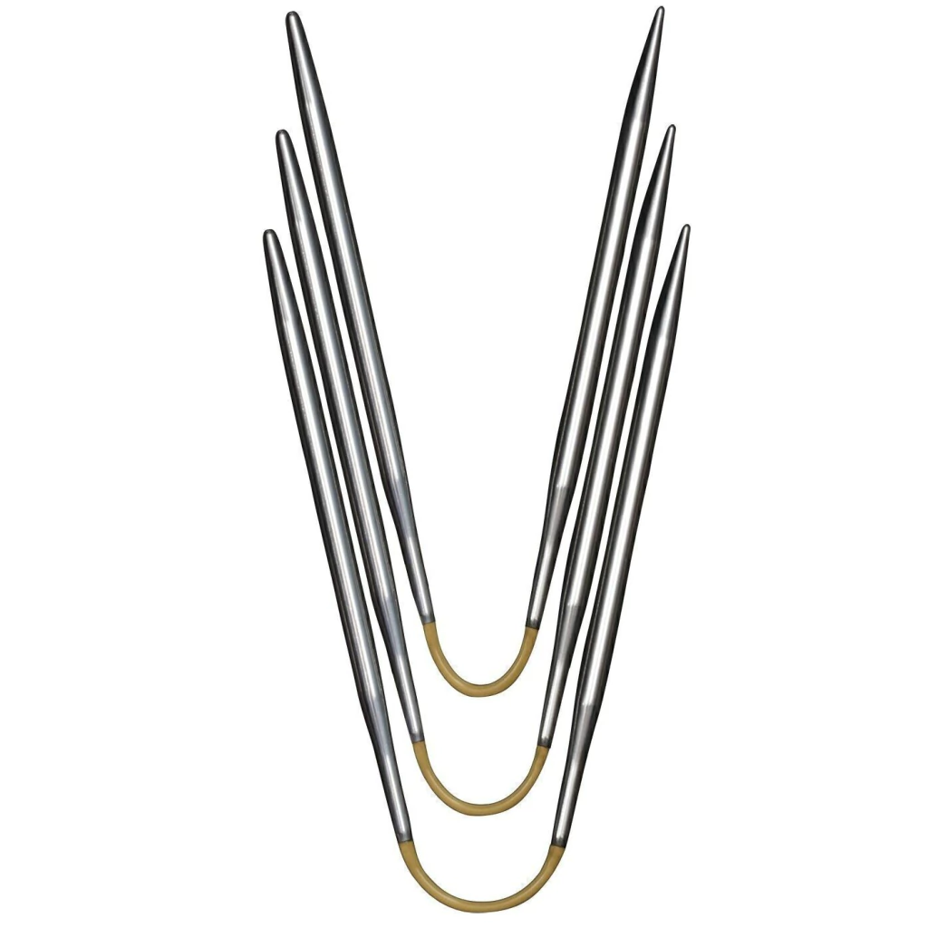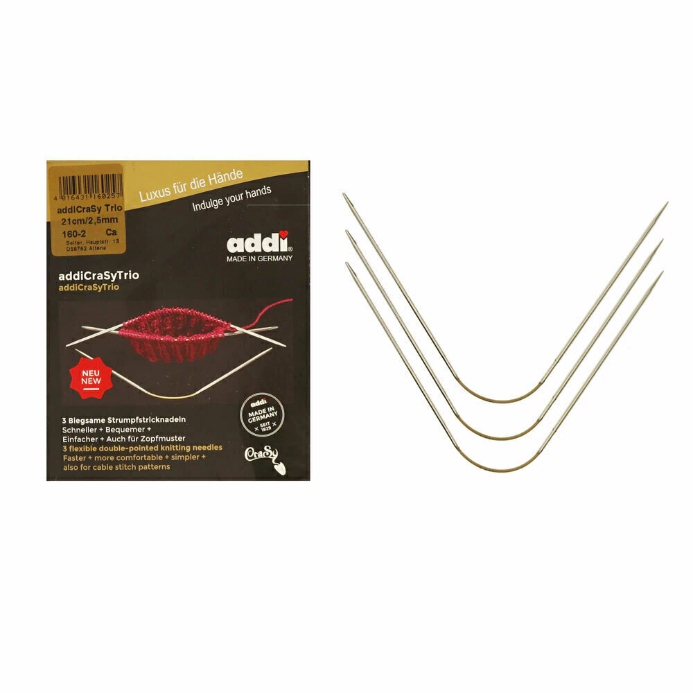 Las agujas circulares fijas de la serie Addi CraSyTrio de la empresa Alemana ADDI son la revolución en el tejido circular de poco diámetro. Estas agujas son la nueva forma de tejer medias, escarpines y puños pequeños! Este juego de 3 agujas circulares flexibles son una alternativa a las clásicas agujas de doble punta. Solo es necesario distribuir las puntadas en dos de las agujas y tejer con la tercera. Fabricadas en Alemania, el largo total de las agujas es de 21 cm con una longitud de las puntas de 8,5 cm cada una. Disponibles en grosores de 2 a 5 mm.