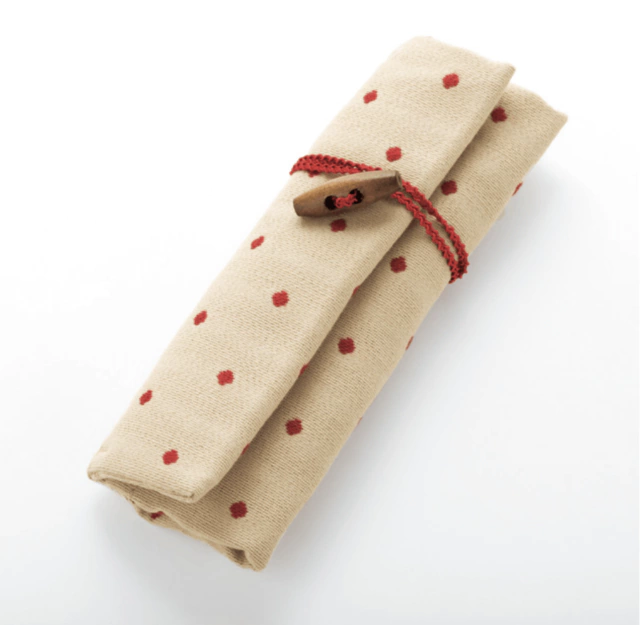 Transporta cómoda y fácilmente todos tus materiales cerrando el set con la cinta roja y el botón tipo trenca. El estuche, hecho de tela, lleva también una cuerda con un enganche para colocar unas tijeras. Se divide en 2 bolsillitos interiores para guardar las agujas de corchet y un pequeño alfiletero para las agujas laneras.