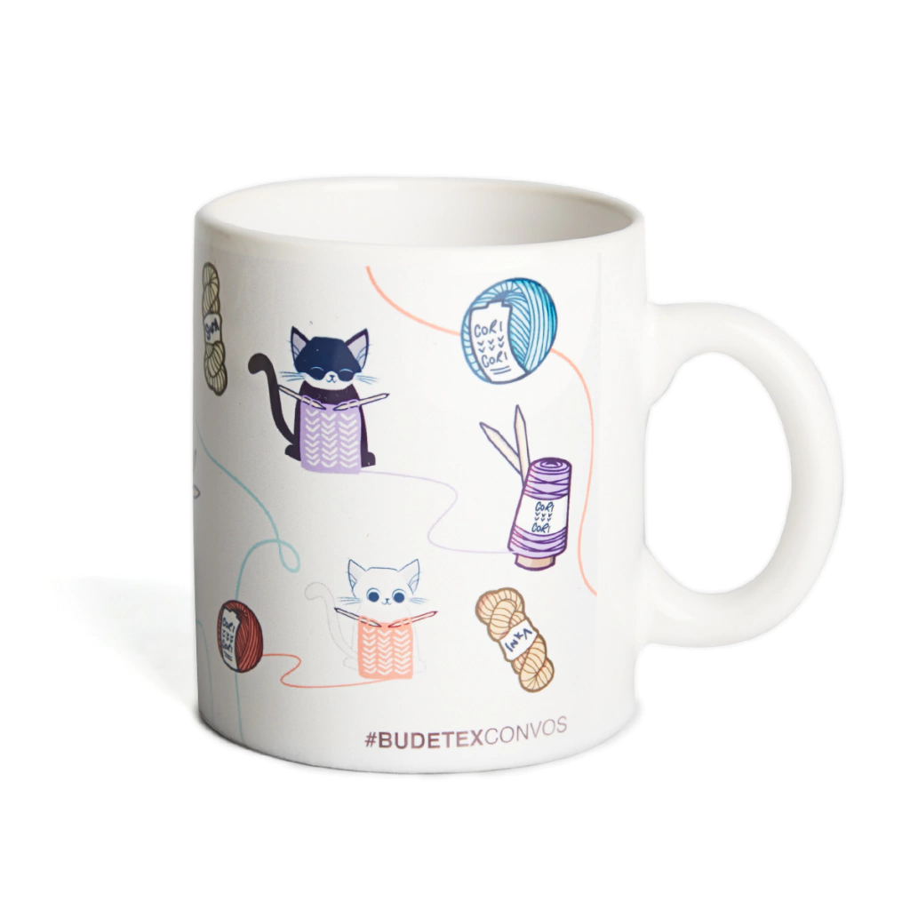 Y más si lo que tejen son hilados de Budetex! Esta taza cerámica está impresa con motivos de gatitos tejedores y algunos de los hilados de Budetex como Cori Cori, Sura e Inka.